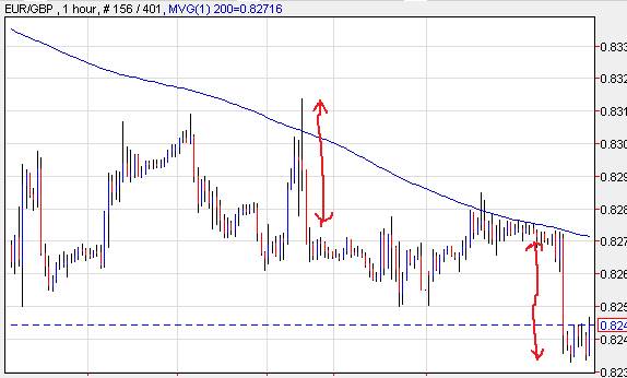 On the chart below, you can see how price dropped sharply alongside the red double arrow, it spent a considerable amount of time consolidating, and it touched the declining 1 hour 200 bar moving average but failed to penetrate. At this stage we cannot know where price will really go, it all depends on more complex market data. It finally failed to cross the average and dropped sharply. The drop is identical in magnitude to the first one; you can see them both alongside the red double arrows. The watchful trader would have exited the market at exactly that level, without risking any further directional trades, then as the trader would have expected price to consolidate they could engage in short term binary option trading, essentially fading every move the market made.